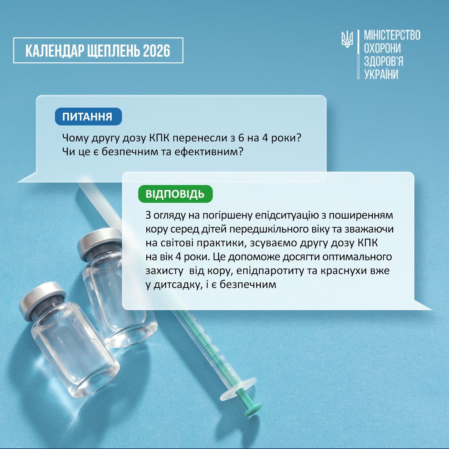 Існує достатня кількість доз вакцини для перехідного періоду. Діти вказаного віку зможуть отримати другу дозу КПК в 5 років у випадку звернення батьків за вакцинацією. Разом з цим, цілеспрямовано запрошувати на другу дозу медичні працівники будуть дітей віком 4 та 6 років.
