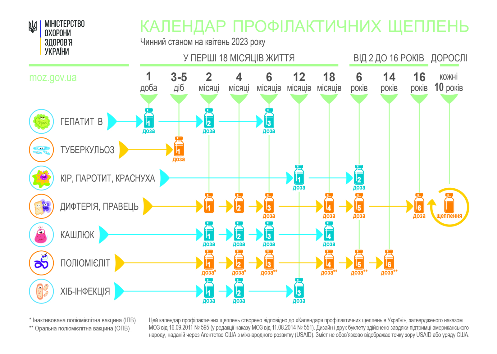 13 листопада 2023Вакцинація в Україні проводиться відповідно до Календаря щеплень, який розроблено з урахуванням міжнародного досвіду, і на сьогодні за умови його дотримання він є найоптимальнішим для забезпечення повноцінного імунітету. Календар затверджено Наказом Міністерства охорони здоров’я України від 11.08.2014 № 551 «Про удосконалення проведення профілактичних щеплень в Україні».