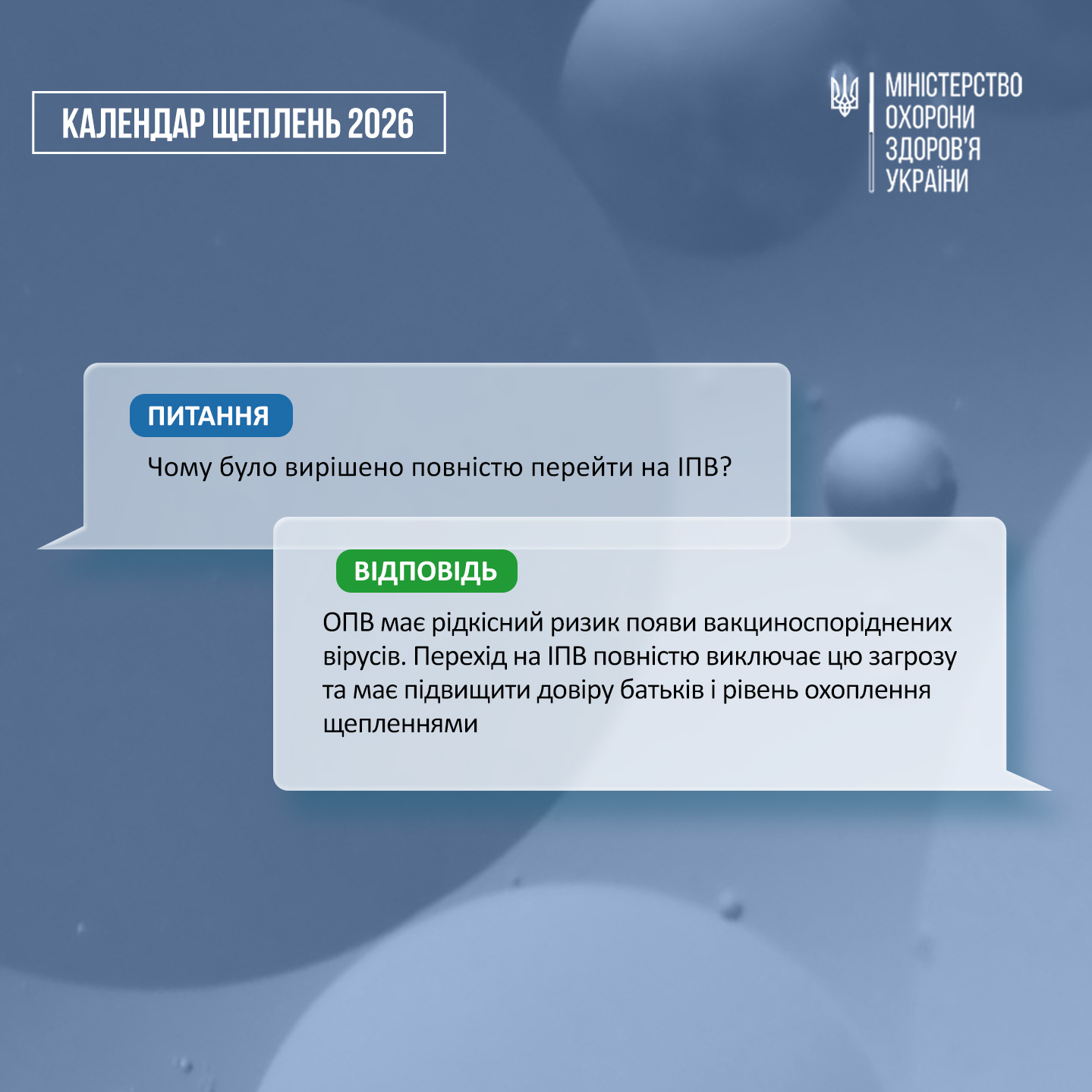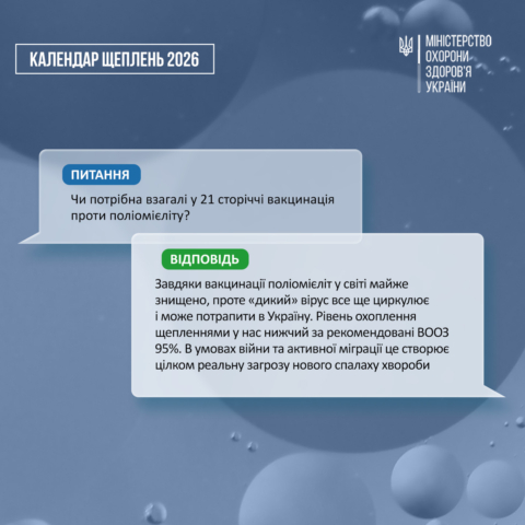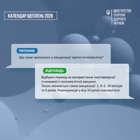 З 1 січня 2026 року відповідно до оновленого Національного календаря профілактичних щеплень вакцинація проти поліомієліту проводиться лише інактивованою поліомієлітною вакциною (ІПВ).