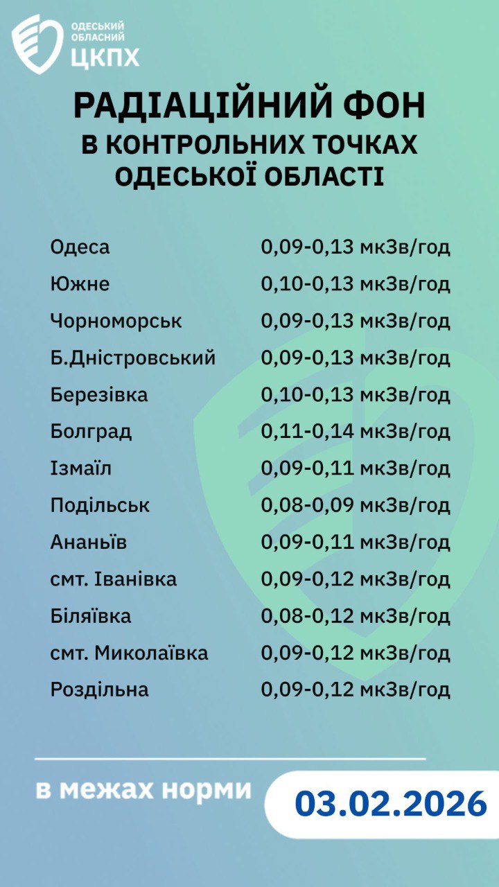 Радіаційний фон на території Одеської області станом на : 03.02.2026