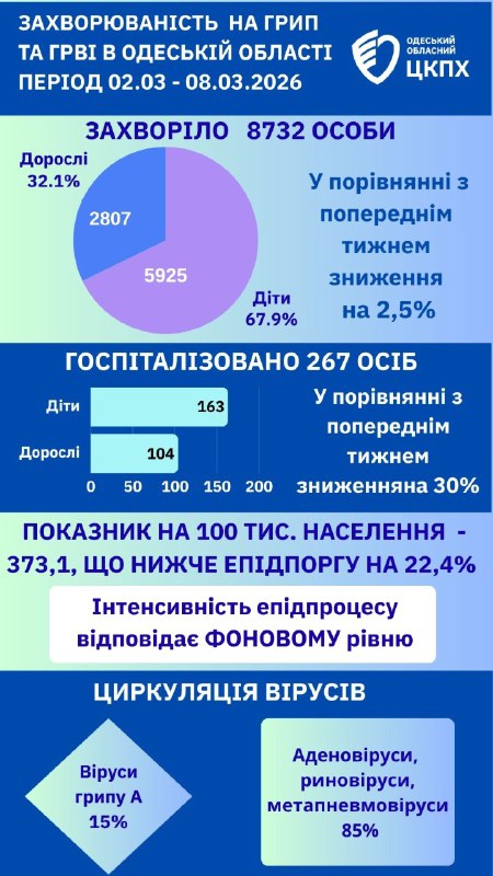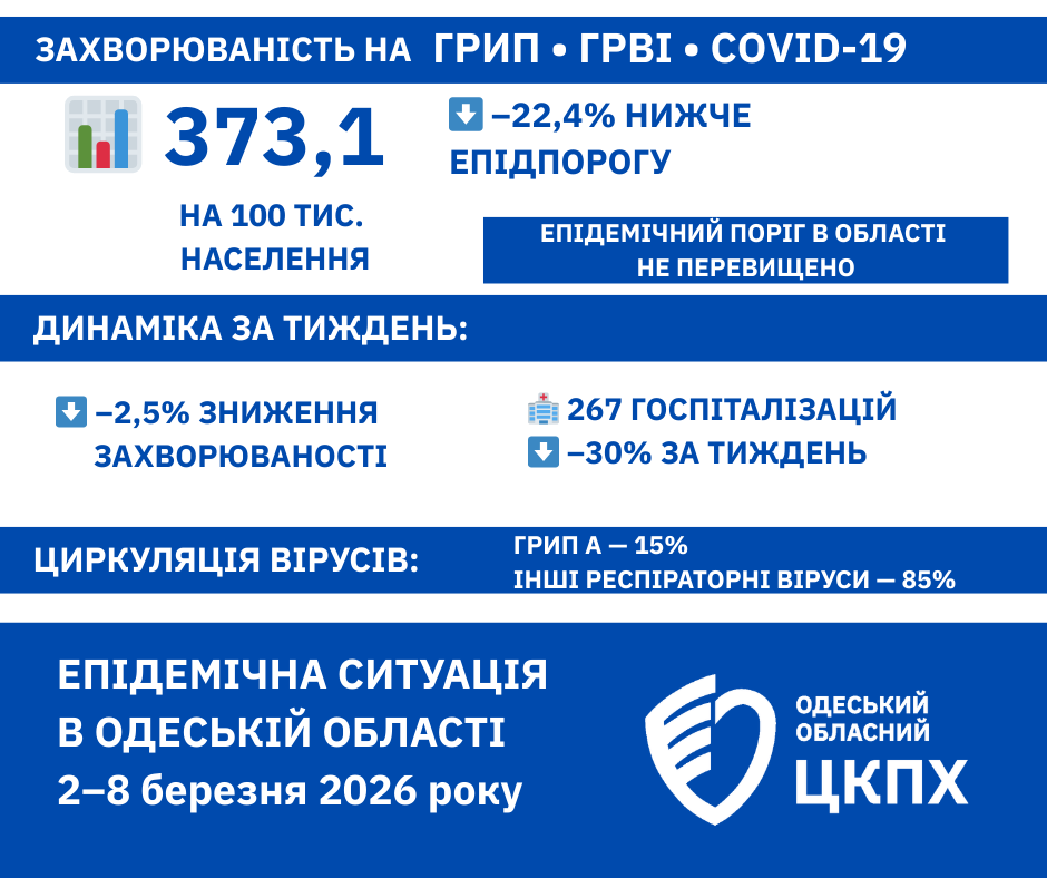 За період з 2 по 8 березня 2026 року в Одеській області рівень захворюваності на грип та гострі респіраторні вірусні інфекції (ГРВІ), включно з COVID-19, залишається нижчим за епідемічний поріг.