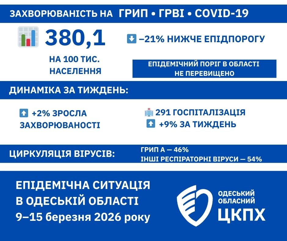 ГРВІ, Грип та COVID-19 Наразі інтенсивність епідпроцесу в Одеській області відповідає фоновому рівню. Показник захворюваності становить 380,1 на 100 тис. населення, що на 21% нижче за епідемічний поріг. Порівняно з аналогічним періодом минулого року кількість хворих зменшилась майже вдвічі — на 45%.