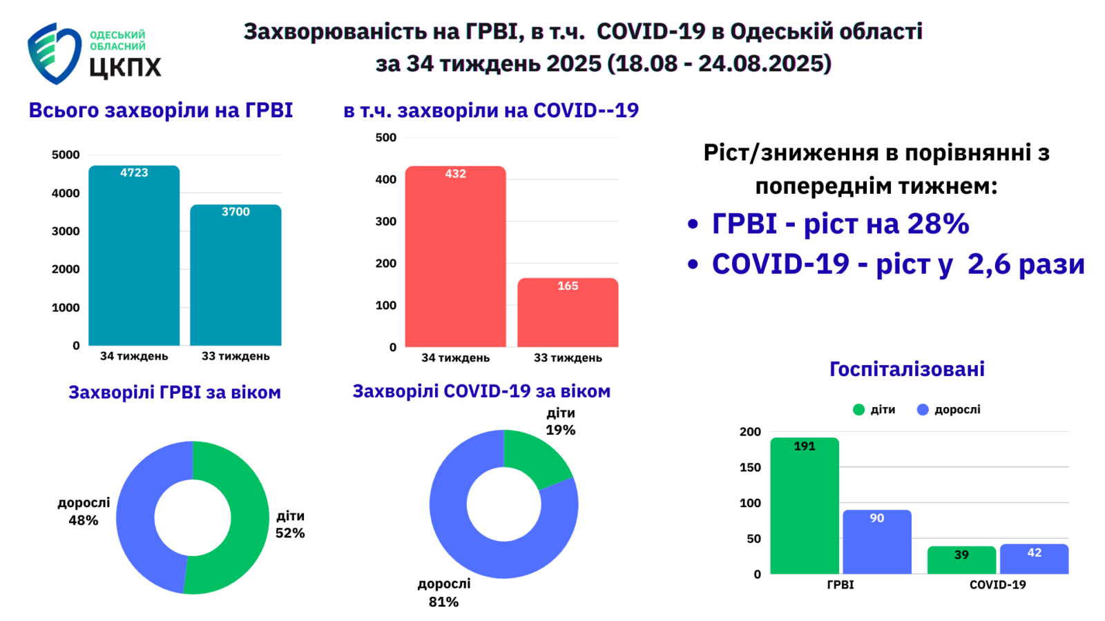 У загальній сумі захворілих на ГРВІ збільшилась питома вага COVID-19 і складала 9% проти 4,4% на попередньому тижні. Зареєстровано 432 випадки (проти 165) – зростання у 2,6 рази. Серед захворілих на COVID-19, на відміну від ГРВІ, переважало доросле населення (81%) з превалюванням вікової групи 30-64 роки (67%). Показник госпіталізації хворих на COVID-19 зріс на 30%.