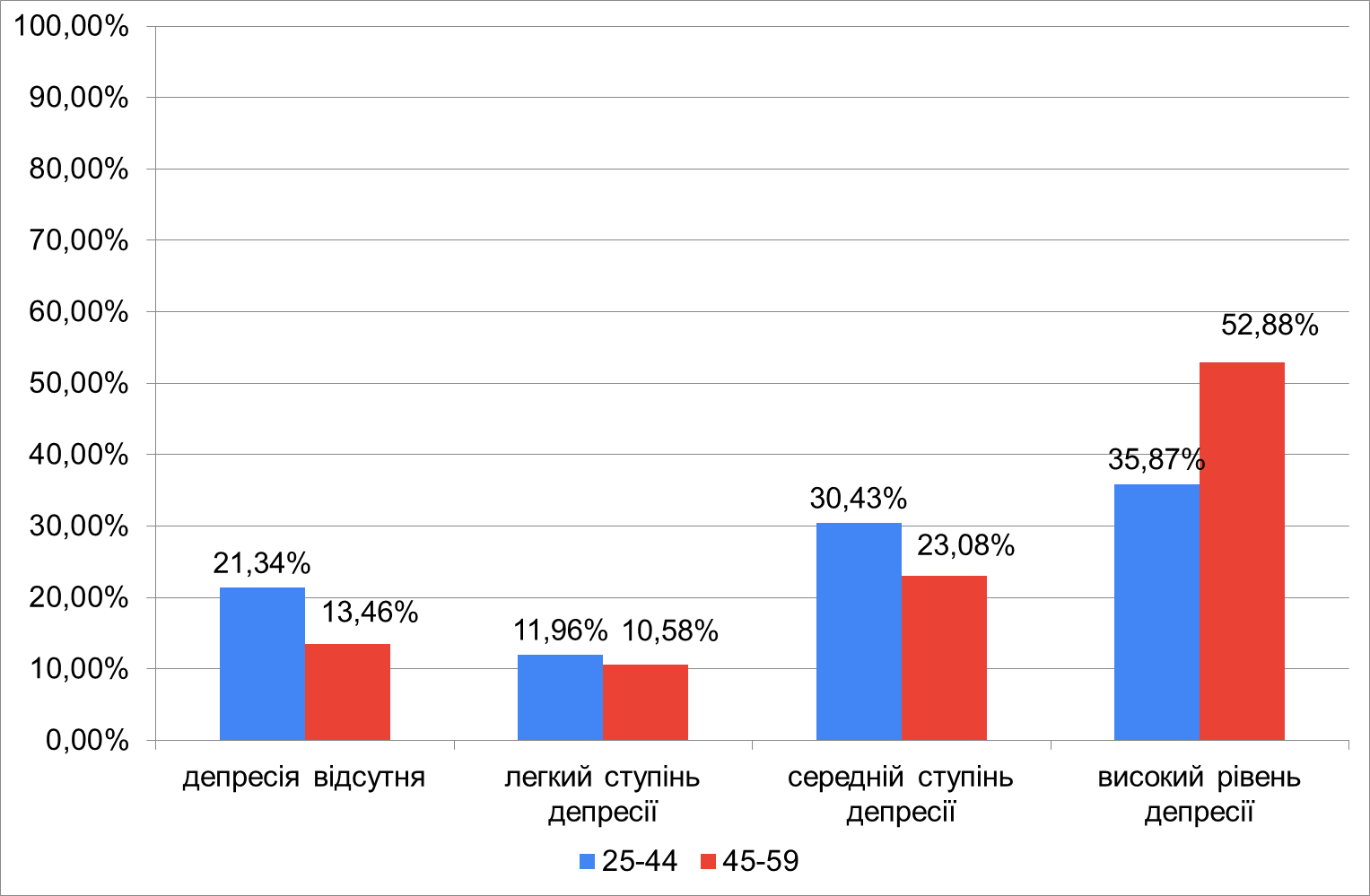 Порівняльний аналіз поширеності ДР серед жіночого населення в залежності від віку виявив, що серед респонденток середнього віку достовірно більше виявлено жінок з високим ступенем депресії, у порівнянні з респондентками молодого віку (25-44 роки: 35,87±5,00%, 45-59 років: 52,88±4,89%, при t = 2,43, р < 0,05). Середній ступінь депресії виявлено у 30,43±4,80% респонденток молодого віку та 23,08±4,13% респондентки середнього віку (t = 1,16, р > 0,05). Легкий ступінь депресії – у кожної десятої респондентки незалежно від віку (25-44 роки: 11,96±3,38%, 45-59 років: 10,58±3,02%, при t = 0,30, р > 0,05).