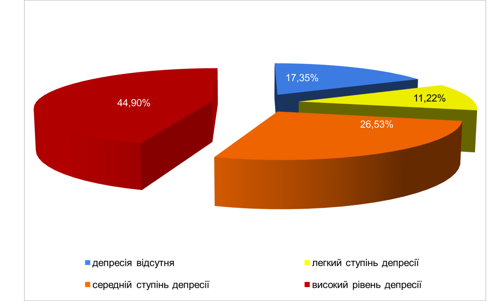 Результати дослідження. Аналіз отриманих даних показав, що тільки у 17,35±2,70% респонденток не виявлено ознак ДР. Легкий ступінь депресії виявлений у кожної десятої респондентки (11,22±2,25%), у кожної четвертої – середній ступінь депресії (26,53±3,15%). В той час як дві з кожних п’яти опитаних мають високий ступінь депресії (44,90±3,55%) (Рис.1).