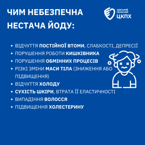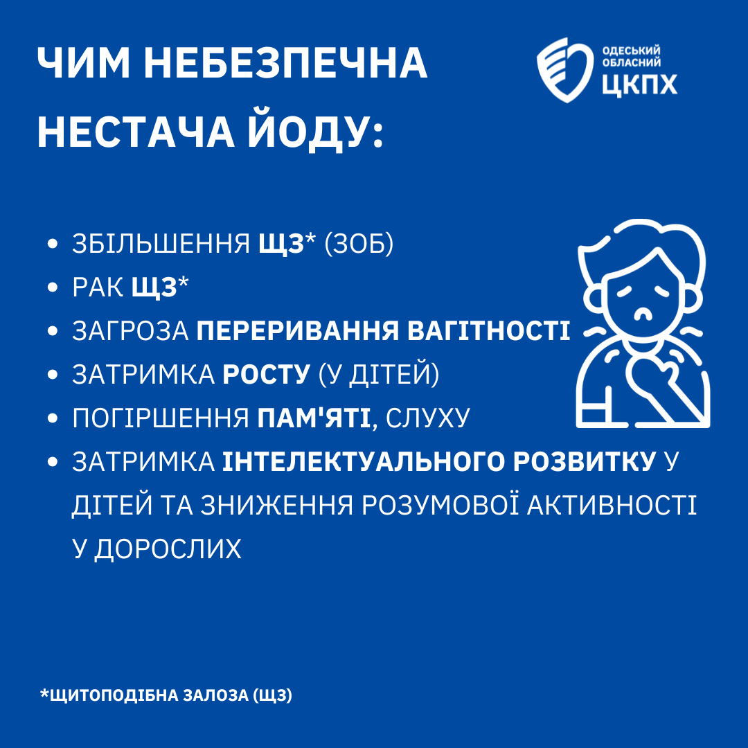 Йододефіцит призводить до утворення зобу, підвищення холестерину, погіршення пам’яті, розумової активності та навіть раку щитоподібної залози. Україна входить до переліку країн із недостатнім споживанням йоду.