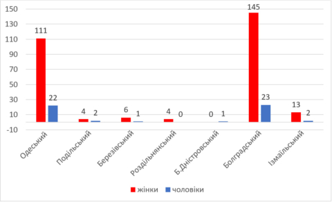 Найбільше всього респондентів приходились на Болградський (50,30%) та Одеський райони (39,82%). У Одеському районі 80,45% приходиться на м.Одесу. Найменше всього – на Білгород-Дністровський (0,30% – 1 особа), Роздільнянський (1,20% – 4 особи), Подільський (1,80% – 6 осіб) райони та м.Чорноморськ (0,90% – 3 особи) (Рис.1).