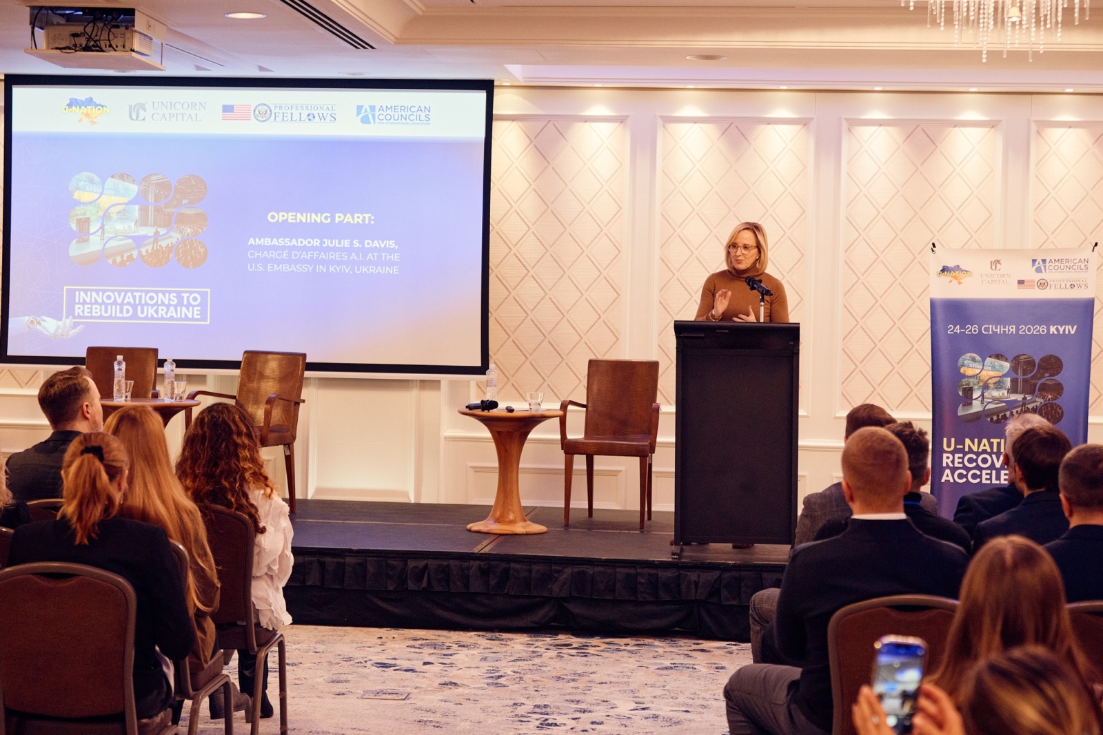 Захід відкрила Посол США в Україні Джулія Девіс. Представники U.S. Embassy Kyiv Ukraine презентували програми з підтримки експорту, економічної співпраці між США та Україною, а також освітні ініціативи American Councils for International Education, спрямовані на розвиток лідерства у сфері бізнесу та інновацій.