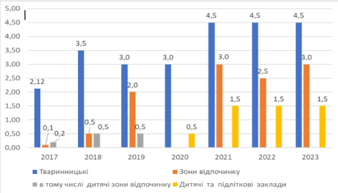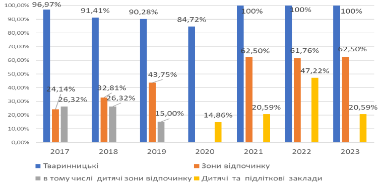 Слід зазначити, що тваринницькі об’єкти – об’єкти з найвищим відсотком заселення іксодовими кліщами (100% перевірених об’єктів у 2021-2023 роках). Дві третини перевірених у 2023 році зон відпочинку були заселені іксодвими кліщами (62,5%). У 2023 році одна п’ята дитячих та підліткових закладів були заселені іксодовими кліщами (у 2022 році – майже половина – 47,22%).