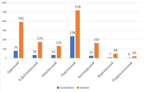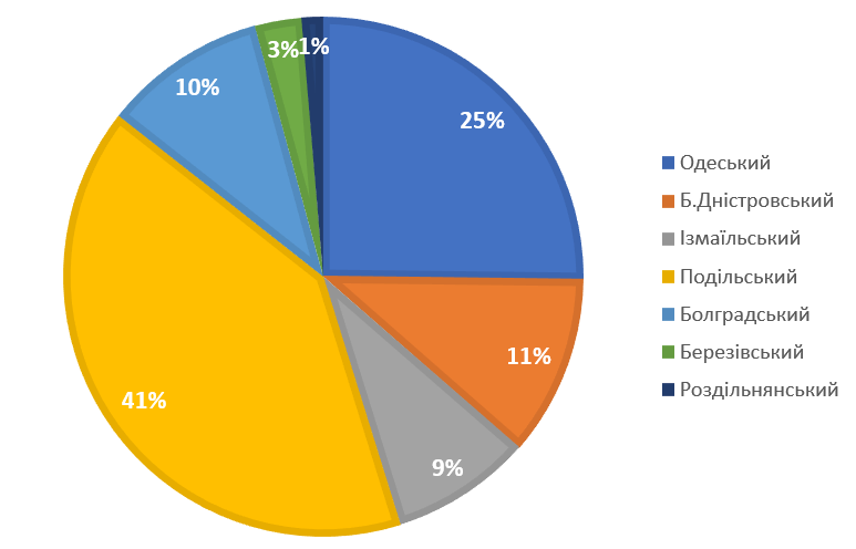 Найбільше всього респондентів приходились на Подільський (40,43%) та Одеський (25,19%) райони. Найменше всього – на Роздільнянський (1,26% – 24 особи), Березівський (2,94% – 55 осіб) та Ізмаїльський (8,77% – 164 особи) райони (Рис.1).