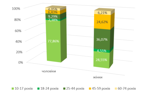 Майже вісімдесят відсотків (77,54%) респондентів це жінки, в основному шкільного, молодого та середнього віку (28,55%, 36,07% та 24,62% від загальної кількості жінок-респондентів, відповідно). В той час, як більшість чоловіків-респондентів приходилась на шкільний вік (77,86% від загальної кількості чоловіків-респондентів) (Рис.2, 3).
